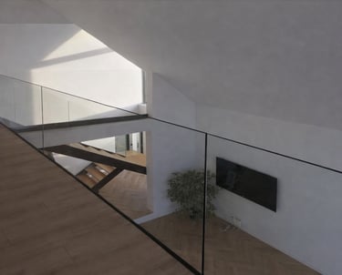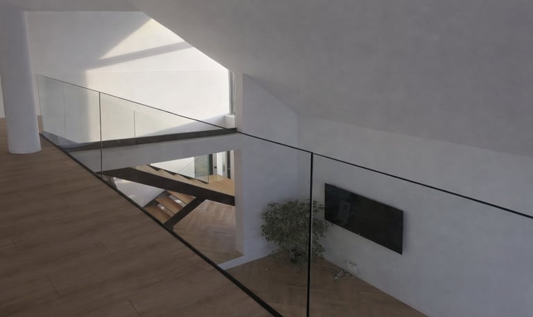 Balustrady szklane zapewniają bezpieczeństwo przy zachowaniu maksymalnej lekkości wizualnej. Przezroczyste tafle szkła podkreślają nowoczesny charakter wnętrza i pozwalają na swobodny przepływ światła. Całość tworzy elegancki, przestronny efekt.